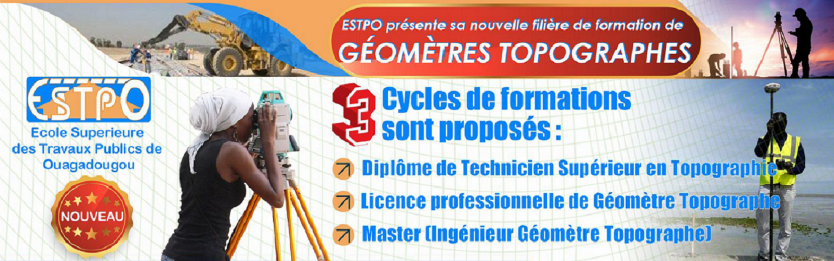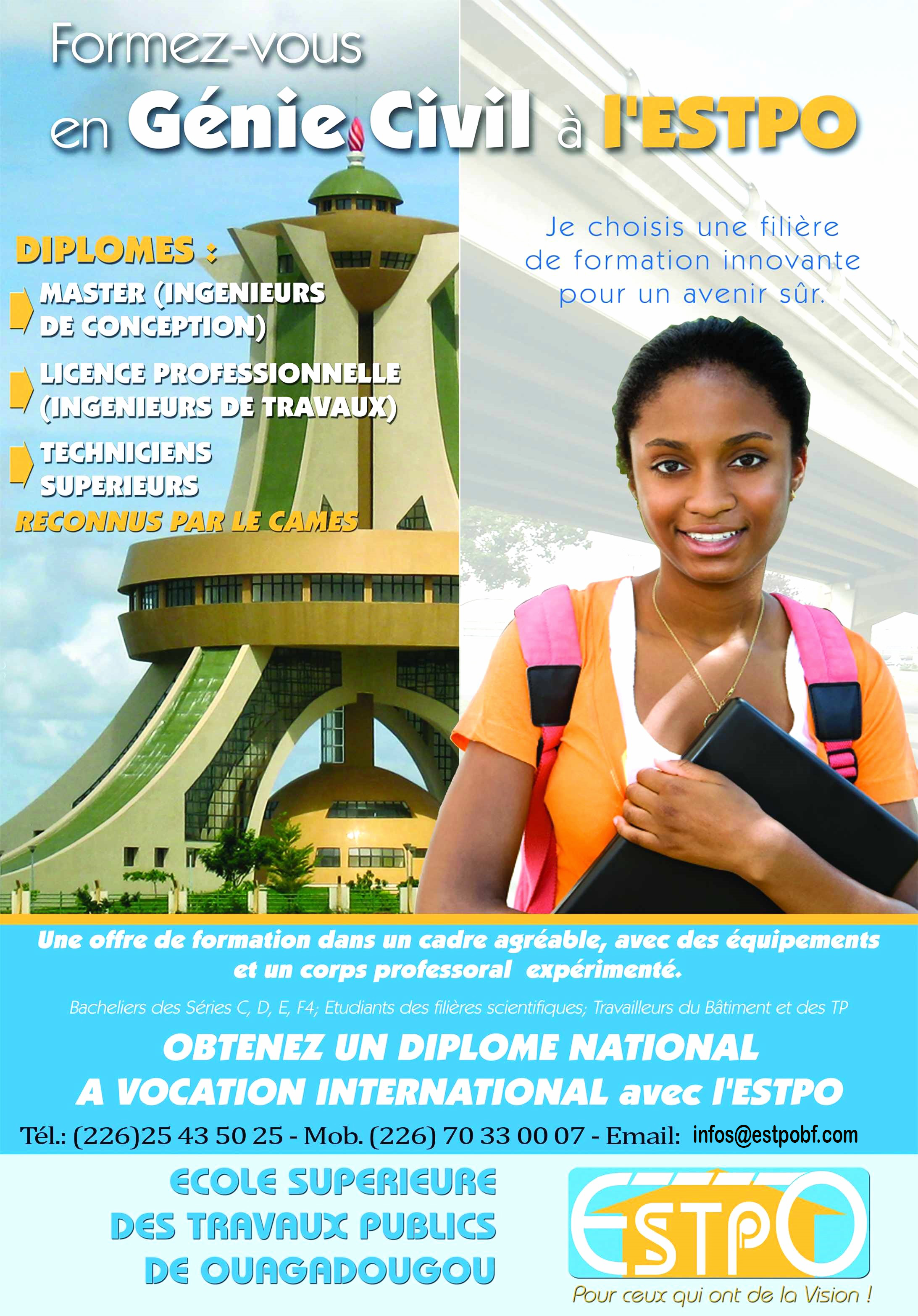 L’ESTPO s’est fixé pour objectif de former des Ingénieurs de Conception de haut niveau en génie civil (bac+5), des Ingénieurs des Travaux (bac+3) et des techniciens supérieurs (bac+2).